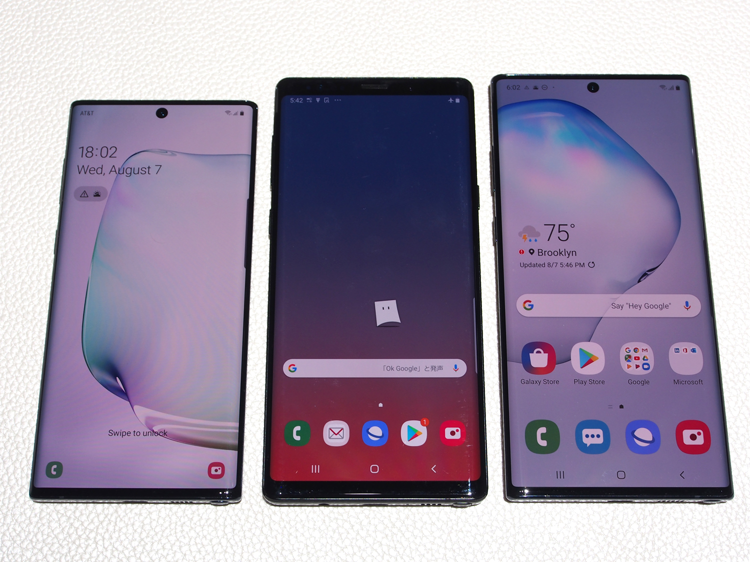 ▲左からGalaxy Note10、Galaxy Note9(ドコモ版)、Galaxy Note10+