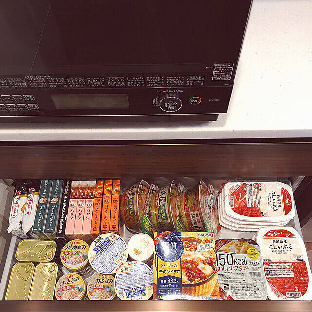 キッチンやパントリーなどの引き出しに保存食を収納されている方も多いはず。shirokumaさん宅でも、引き出しに保存食を収納されていましたよ。パズルのように上手に組み合わせて、種類ごとに隙間なく美しく並べられています。引き出しに収納すれば、上からパッと見ただけで何が入っているかが一目瞭然です。