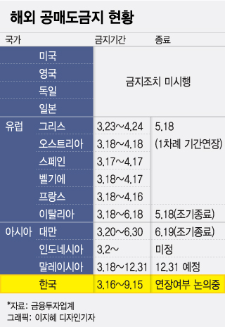 한국이 포함된 아시아는 대체로 장기간에 걸쳐 공매도를 금지하는 경우가 많았다. 아시아에선 한국과 대만, 인도네시아, 말레이시아 4개국이 3월에 공매도 금지조치를 시행했고 이중 대만은 당초 계획했던 6월30일이 아닌 6월19일에 조기종료했다.