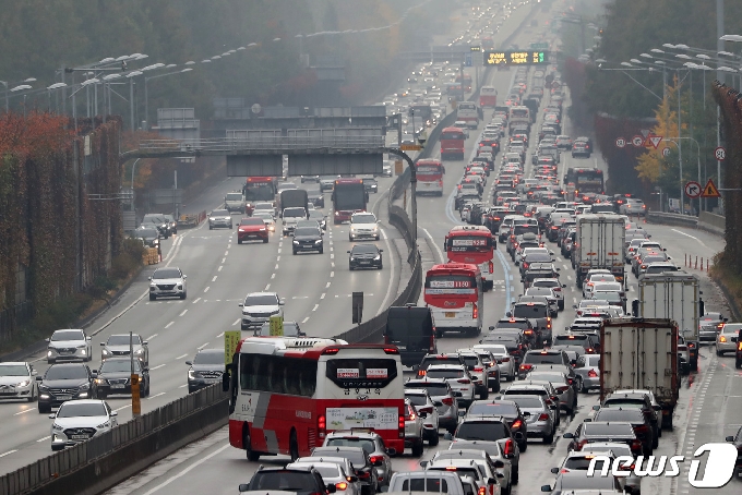 (서울=뉴스1) 임세영 기자 = 막바지 단풍 인파로 붐빈 1일 오후 서울 서초구 잠원IC 인근 경부고속도로가 차량들로 정체현상을 보이고 있다. 한국도로공사에 따르면 이날 전국 고속도로 이용 차량이 418만대 정도일 것으로 분석된다. 서울로 향하는 상행선의 정체는 오전 11~12시쯤 시작돼 오후 5시~6시쯤 절정에 달했다가 오후 10시~11시에 해소될 것으로 내다봤다. 2020.11.1/뉴스1