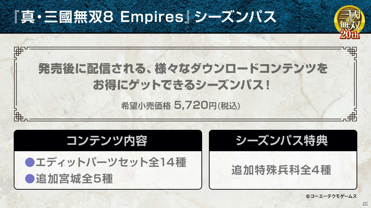 パッケージ版は本日10月2日より順次予約を開始。予約開始にあたり、各種店舗特典やGAMECITY限定セットの情報が公開されたほか、ダウンロード版の予約特典、ダウンロード版専用の豪華版である「真・三國無双8 Empires Deluxe Edition」の内容、本作をより楽しむことのできる、シーズンパスの内容についても発表されている。ダウンロード版については、後日予約を開始する予定とのとこと。