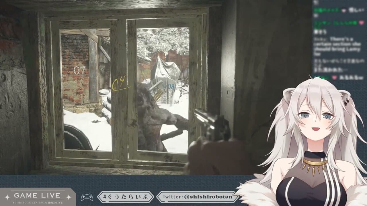 対比動画の元となったワンシーン。獅白ぼたん『バイオハザード ヴィレッジ』配信より。
