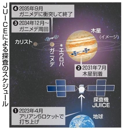 【ワシントン共同】欧州宇宙機関(ESA)は13日、木星と三つの衛星に向け探査機JUICEを南米フランス領ギアナからアリアン5ロケットで打ち上げる。2031~35年に現地で観測を実施し、生命を育める環境があるのか、木星は今の太陽系の形成にどう関与したのかを探る。日本も機器開発に参加した。