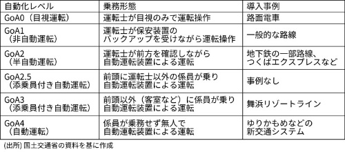 自動車の自動運転に「レベル0」から「レベル5」までの6段階の基準があるように、鉄道の自動運転にも「GoA(Grade of Automation)」という国際的なレベル分けがある。最も自動化が進んだレベルは「GoA4」で、係員が乗っていない無人運転を指す。日本では1981年に神戸市で開業した新交通システム「ポートライナー」で実用化され、大阪市の「ニュートラム」、東京都の「ゆりかもめ」など新交通システムでは一般的になっている。