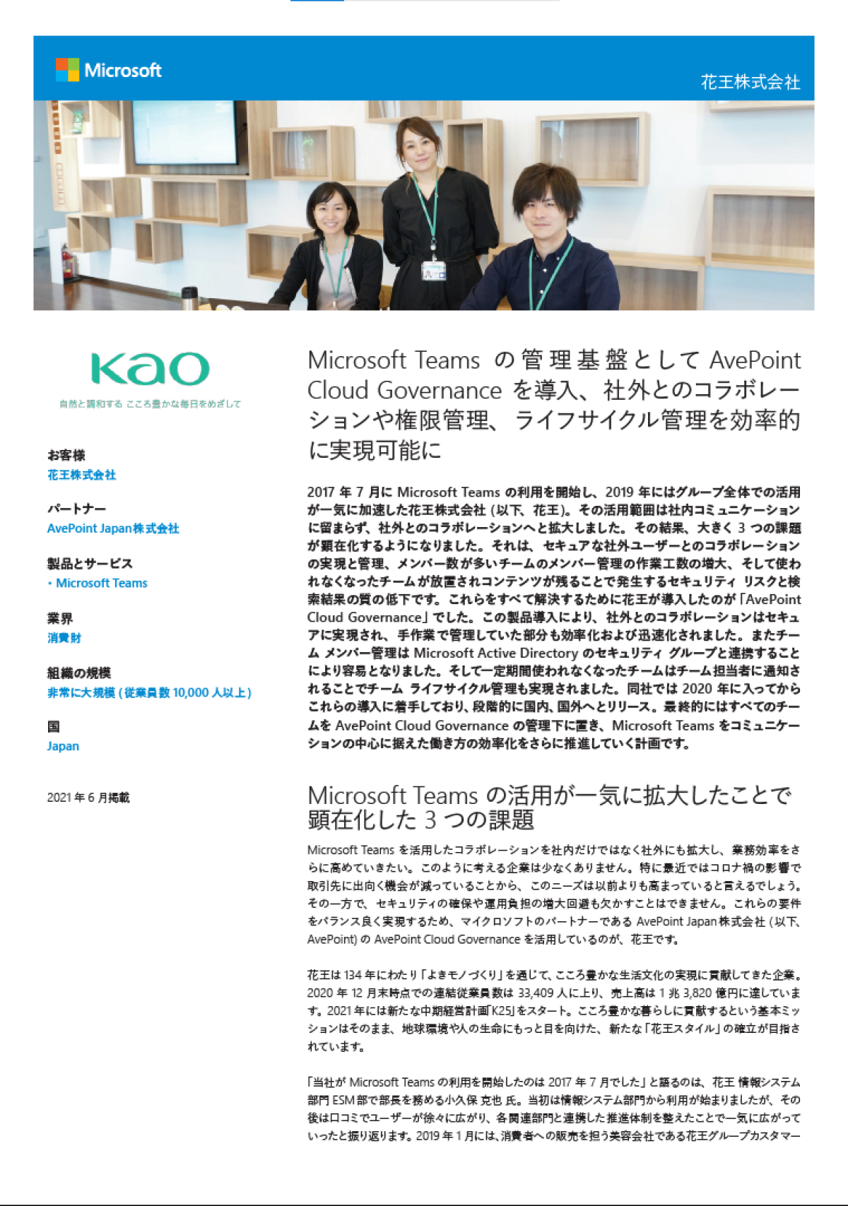 130年以上にわたり、こころ豊かな生活文化の実現に貢献してきた花王。同社は2017年に「Microsoft Teams」の利用を開始し、2019年にはグループ全体での活用を経て社外とのコラボレーションまで活用範囲を拡大してきた。しかし、一気に拡大したことで、社外ユーザーとのセキュアなコラボレーションや作業工数、コンテンツの増大などに関する3つの運用課題が顕在化してしまう。新たな運用管理方法の改善を検討した同社は、実際に課題解決と業務効率化を実現した。本資料では、同社の改善プロジェクトの詳細を担当者が語る。